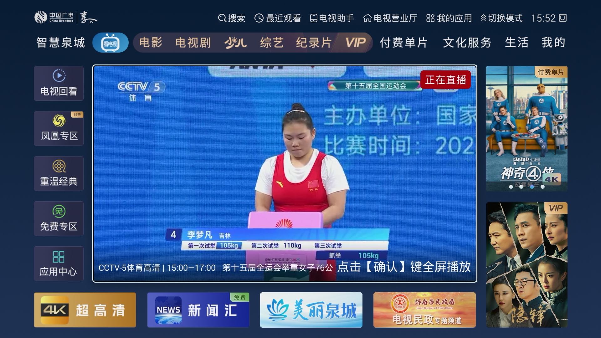 4K超高清臻享館共有十個4K頻道,頻道數(shù)量目前位于全國行業(yè)第一。在這十個4K頻道當中,有兩個是4K直播頻道,分別是央視4K和奧林匹克頻道。還包括電影、電視劇、健身等八個4K輪播頻道。